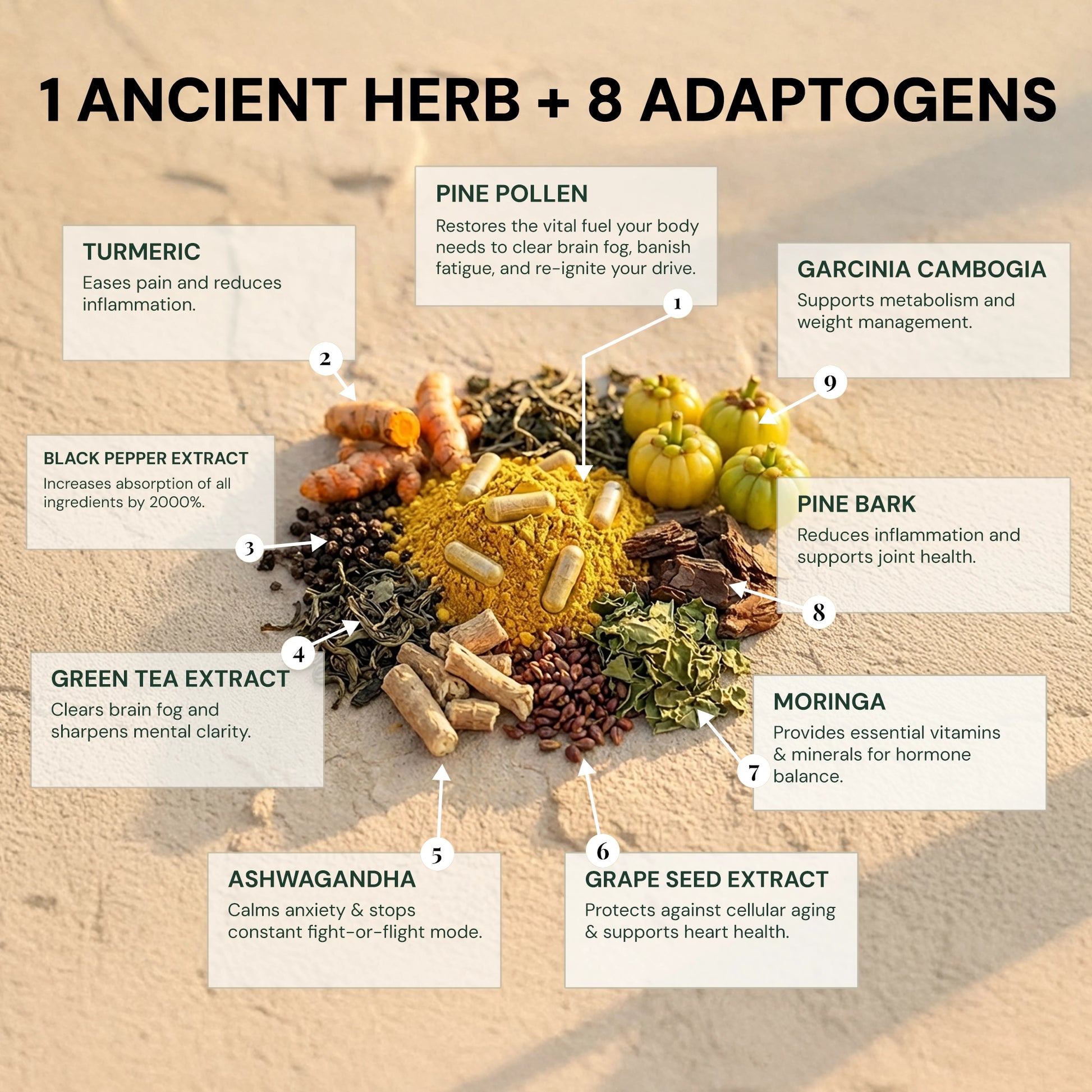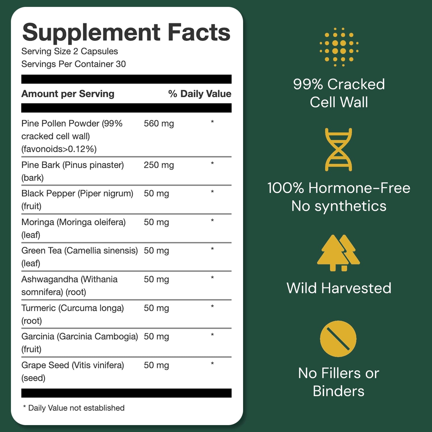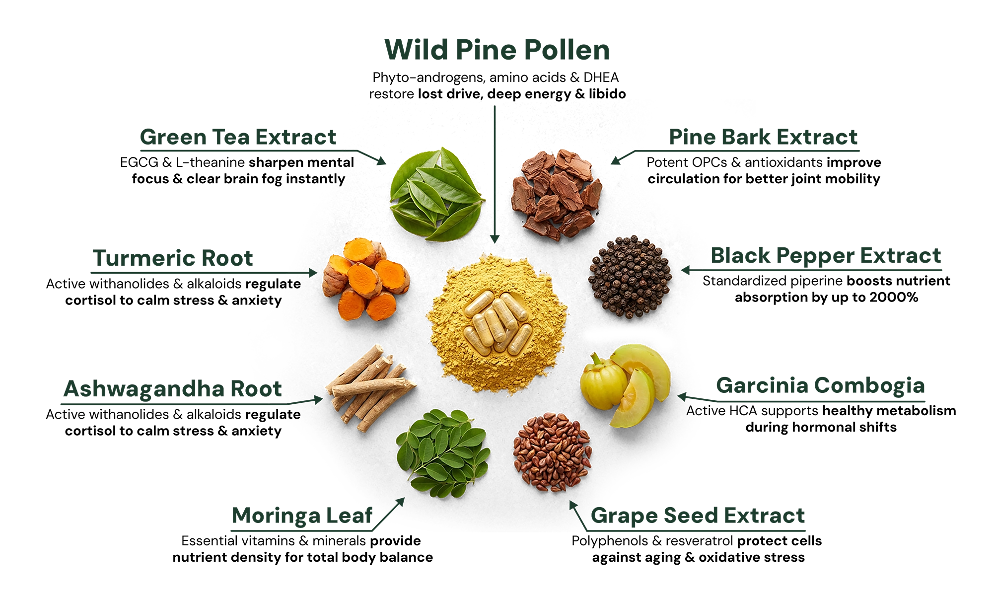 Ashwagandha, turmeric, pine bark, and green tea address inflammation, cortisol, and metabolism. These scientifically selected adaptogens amplify pine pollen's testosterone support for comprehensive hormonal balance.