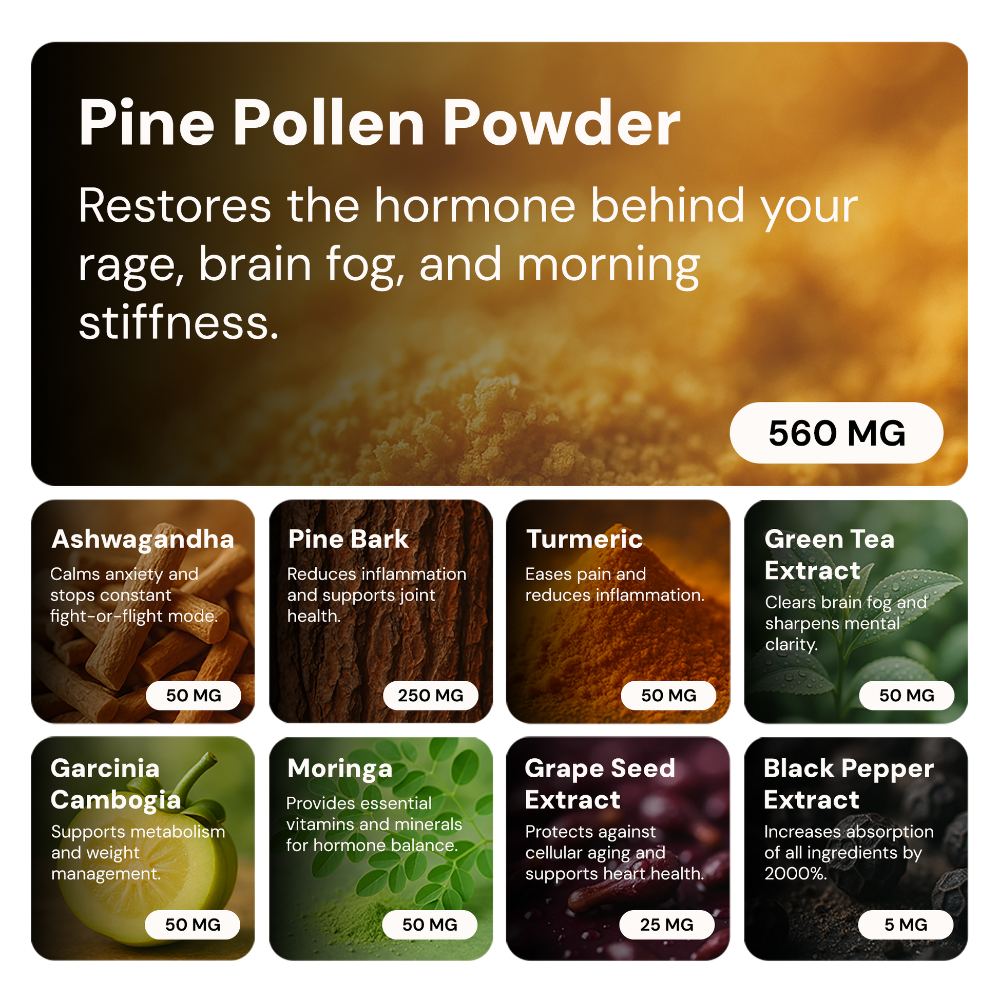 Pine Pollen is a 2,000-year-old Chinese remedy containing natural plant hormones (testosterone) that restore the balance perimenopause destroyed. Enhanced with Ashwagandha, Turmeric, and 6 other adaptogens, it supports your body's natural production—not forcing it into a fixed state like synthetic HRT. Most women notice less rage, clearer thinking, and their libido returning within 2-4 weeks.